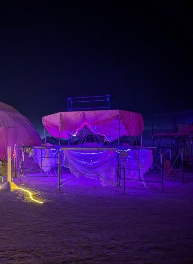 Some installations ask for quiet. Rest inside The Cocoon, a crocheted nest suspended in stillness. Visit the Dreamtemple, the Midnight Oasis, or a glowing Pyramid Portal to share tea, stories, and gentle connection with friends or strangers. Take a moment to listen to soft voices gathered into a collective memory at Whispers or share the primordial vibrations of your voice at Sound Cauldron.