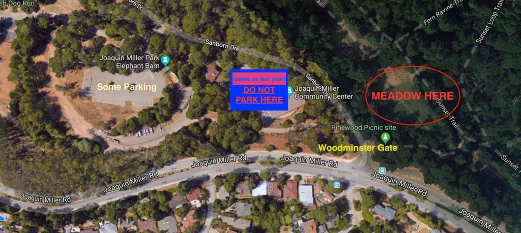 If the two remaining lots and roads inside the park itself are full and you need to park on the street, please stick to Joaquin Miller Road. Do not park at all on the three narrow streets directly across Joaquin Miller Road: Robinson Drive, Butters Drive, and Crane Way are all off limits. Wherever you park, please be very careful and respectful of park neighbors. Do not block driveways, not even a little bit.